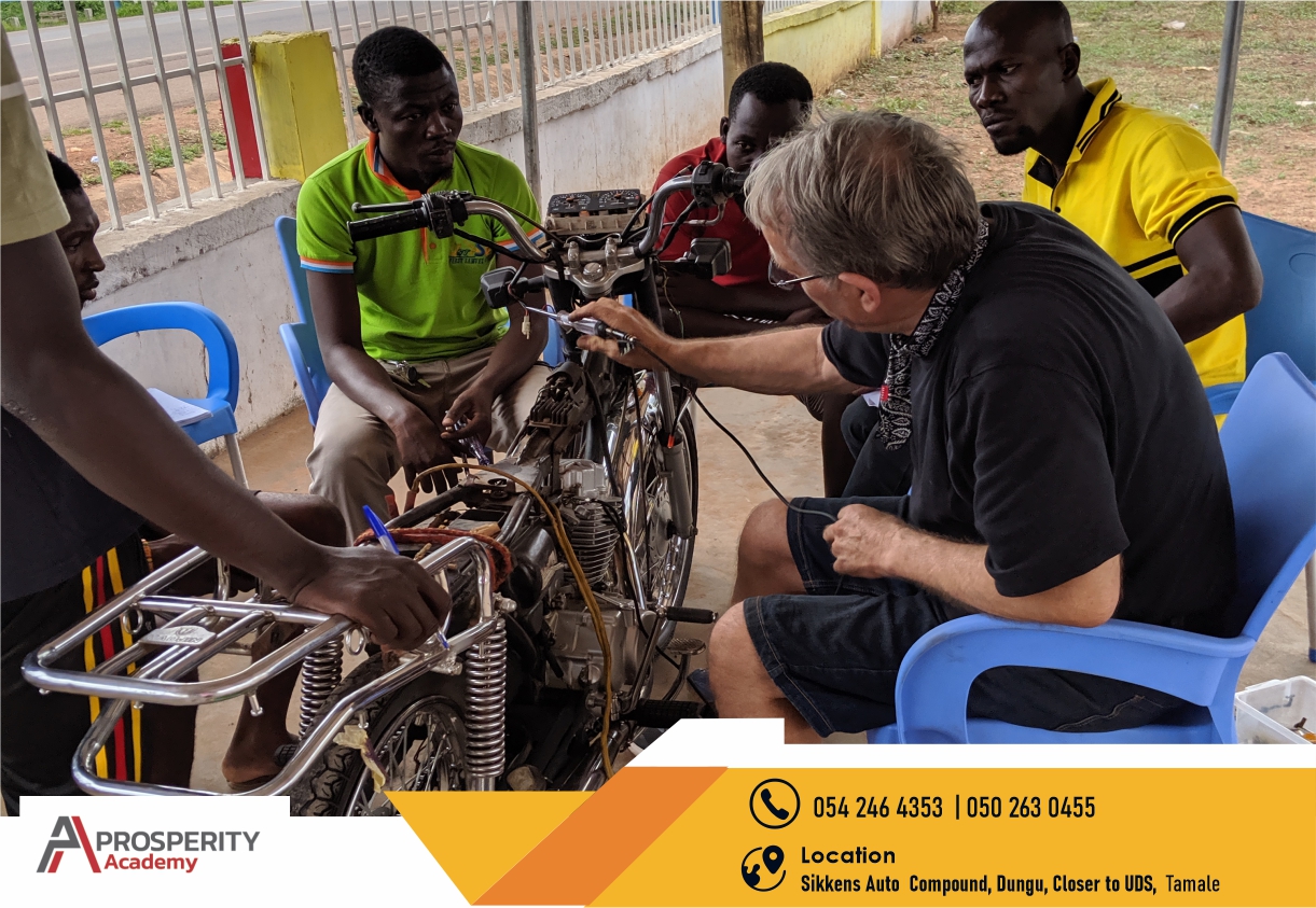 With 120,000 motorcycles in Tamale, a city of 360,000, there was no school to learn how to repair motorcycle electrical systems, so we opened the first school of its kind in Ghana, through our NGO, Standing With Boys.